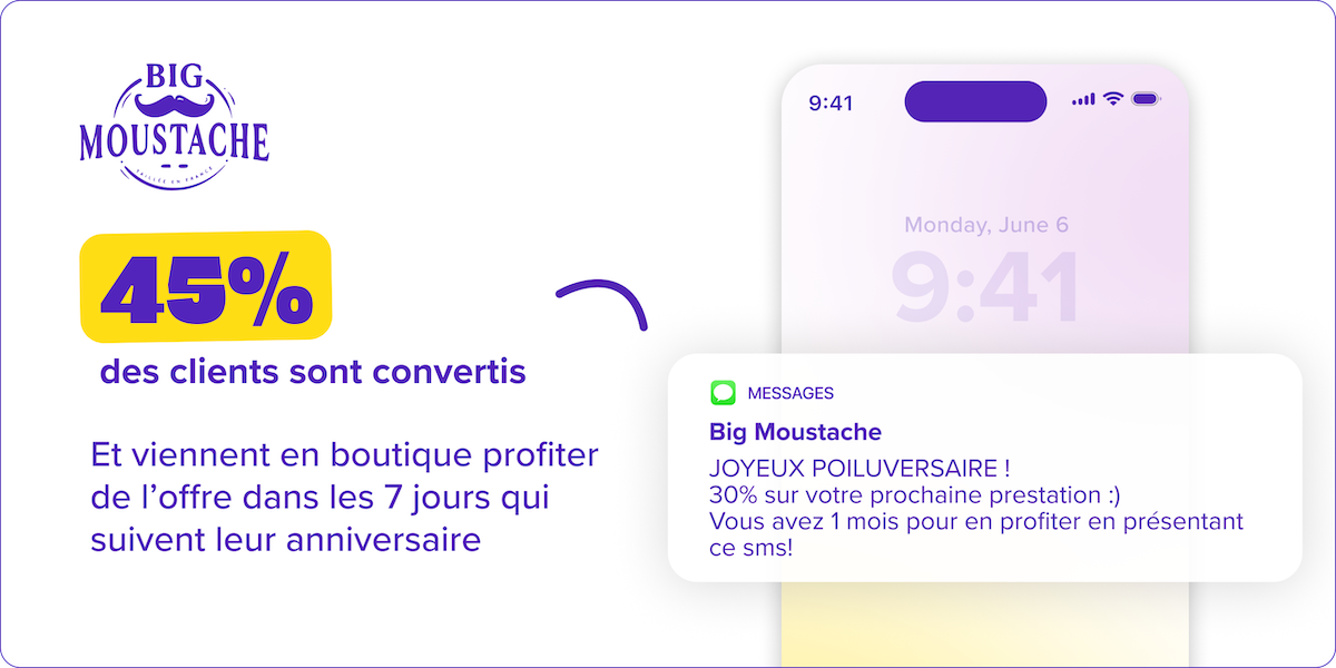 Le SMS d’anniversaire crée une connexion spéciale. Ajoutez un cadeau valable 7 à 30 jours.